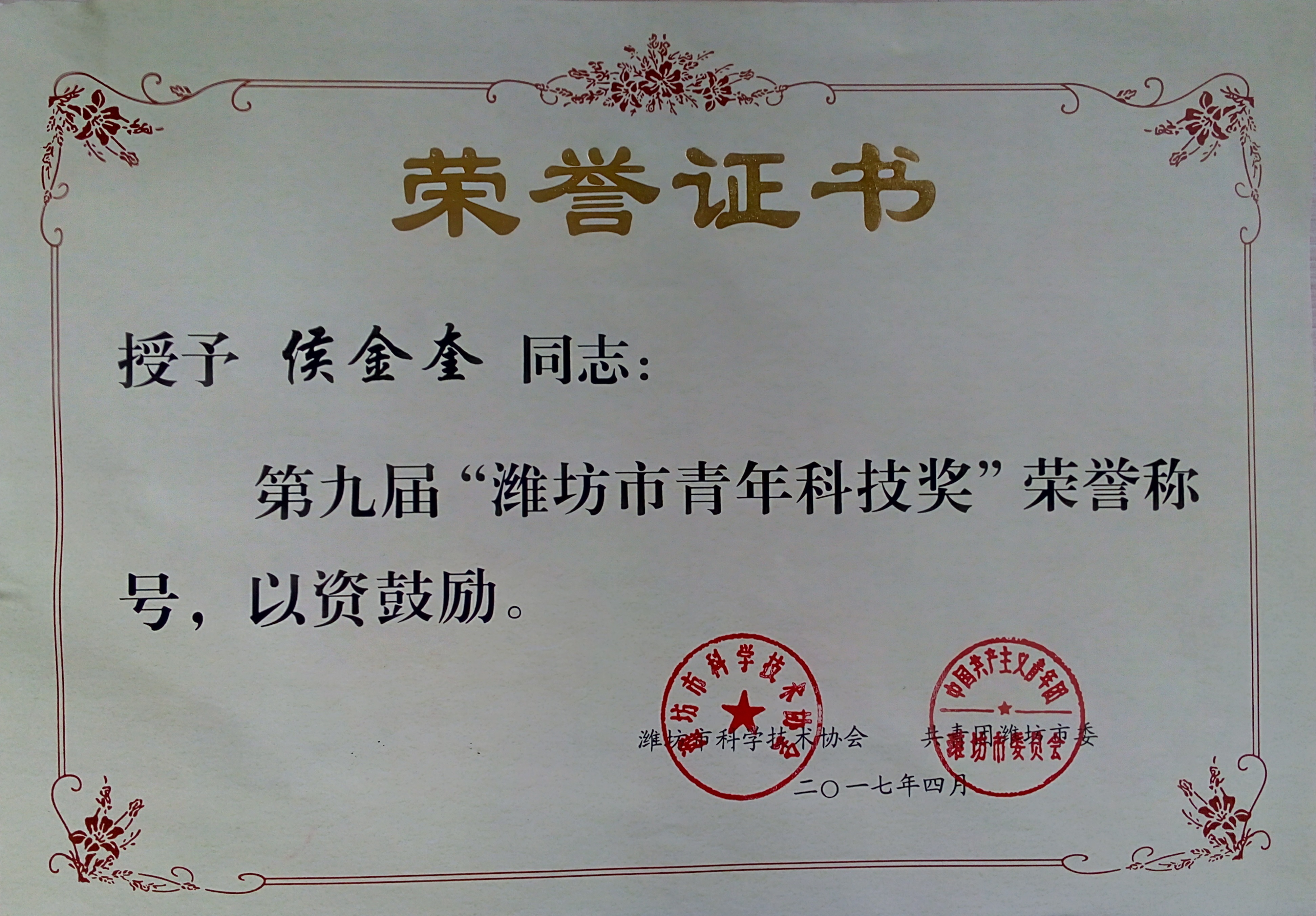 日前,由潍坊市科学技术协会和共青团潍坊市委联合开展的“第九届潍坊市青年科技奖”评选名单揭晓,我院侯金奎博士榜上有名,喜获殊荣。同时,侯金奎博士作为我市优秀科技工作者代表,其事迹在5月28日出版的《潍坊日报》上刊登宣传。