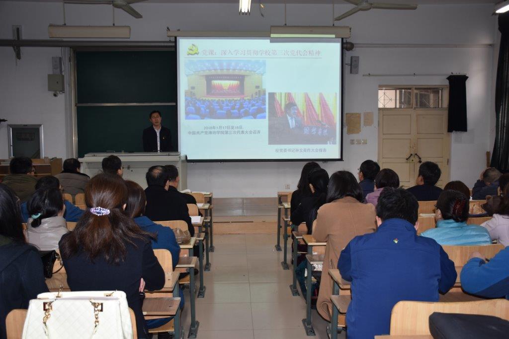 为深入学习宣传学校第三次党代会精神,进一步把广大党员干部和师生员工的思想与行动统一到党代会精神上来,确保党代会确定的各项决策部署落地落实,3月22日下午,在天一教学楼7234党员活动室,院党总支书记王忠山以“学习贯彻党代会精神,奋力谱写事业发展新篇章”为题,为本院全体党员讲党课,其他教职工一并参加听课。