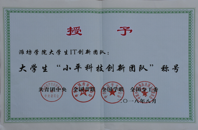 2017年10月,我院“大学生IT创新团队”荣获全国大学生“小平科技创新团队”奖,历经一年的努力,2018年8月,顺利通过验收并参加颁奖及授牌仪式,并获得基金支持,这是我院大学生科技创新又一项标志性成果,也是我院学生科技创新工作取得的历史性成绩。我们定不负重托,砥砺前行,再攀高峰!