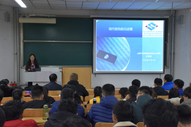 11月17日上午,山东大学王美琴教授在天一楼7316教室为我院师生作了题为“现代密码前沿进展”的学术报告。副院长陆述田主持了报告会。