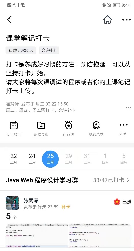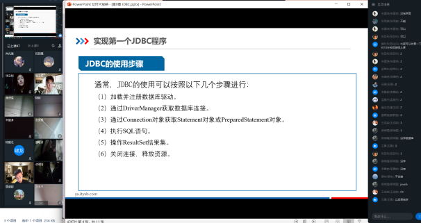 《Java Web程序设计》为软件工程、计算机科学与技术专业的必修课程,通过智慧树平台,已完成网络课程的建设,各种教学资料完备充足(课件、大纲、视频、习题、作业、讨论等),具备学生自学的条件。但是该课程的实践性较强,涉及到大量的程序编写和调试,学生自学很难领悟其中的关键知识点,因此就需要借助直播平台来实施在线课堂教学。根据课程特点以及在线学习学生的特点,几经对比,崔老师最终选择了钉钉群在线课堂的直播方式。
