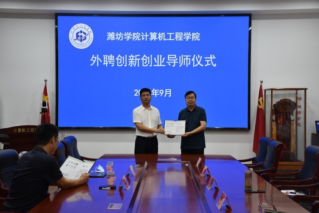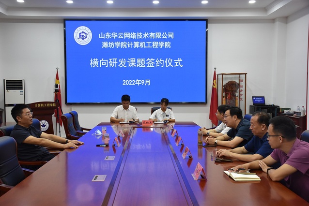 9月2日,山东华云网络技术有限公司董事长郭平一行到访交流洽谈,双方签署了陈爽老师主持的《潍坊高新区全息感知平台》横向研发课题协议。王成端院长为企业研发带头人颁发了创新创业导师聘任证书。副院长陆述田、网络工程专业教师代表参加了本次活动。