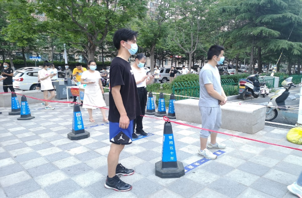 志愿者根据检测时间去往时,排队人员已经开始陆续增多,志愿者听从社区相关工作人员安排,在队伍各个位置维持着秩序,引导待检测人员有序间隔一米距离。