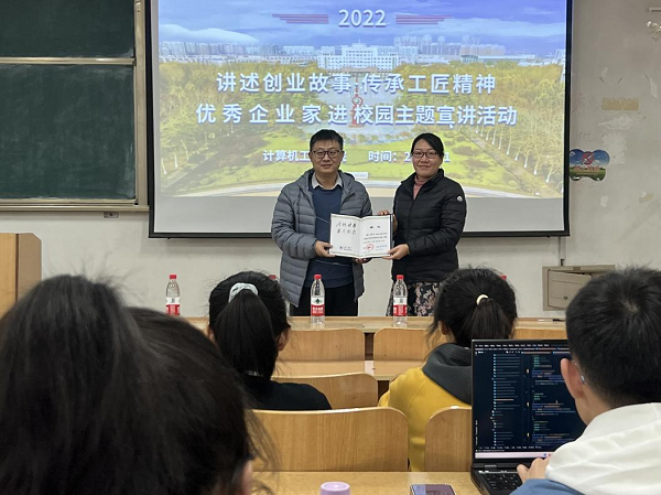 为深入贯彻落实党的二十大精神,持续做好“讲述创业故事·传承工匠精神”优秀企业家进校园工作,教育引导大学生认清形势,转变观念,不断提升就业、创业意识,提升求职择业能力,18日下午4点,我院邀请了山东桥通天下网络科技有限公司总经理曾志先生和柏桥集团产教融合执行总监魏庆强先生于天一楼7207教室为2022级新生讲授了一场生动的专题讲座。活动伊始,我院党总支书记张晓静为优秀企业家颁发创新创业导师聘书,并就“优秀企业家进校园系列活动”进一步提升学生职业素养,加强校企对接、探索校企互动、校企合作等高等教育人才培养和促进大学生积极就业新机制等方面,交流研讨新思路、新模式。