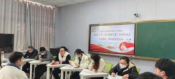 为促进2023届毕业生更好地备战研究生复试及调剂工作,3月23日下午,我院教师第二党支部在7302智慧教室举行“深入学习贯彻落实党的二十大精神”教师二支部“成长领航工程”系列活动之考研复试、调剂指导交流会。教师第二党支部张永会、张辉辉、代江艳、张秀洁、逄顺鹏、秦琦冰、陈春雷、孙静、盖枚岭9位老师、2019级辅导员刘见学、张爽以及本院二十余名备战研究生复试、调剂的毕业生参加了活动。