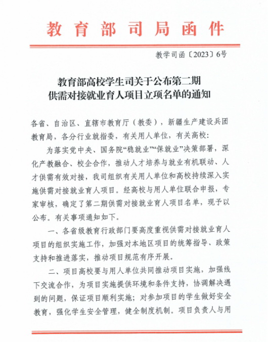 教育部供需对接就业育人项目是落实党中央、国务院“稳就业”“保就业”决策部署,深化产教融合、校企合作,推动人才培养与就业有机联动、人才供需有效对接的重要举措。我院此次获批的供需对接就业育人项目,分别属于“就业实践实习基地建设”和“定向人才培养培训项目”类别。