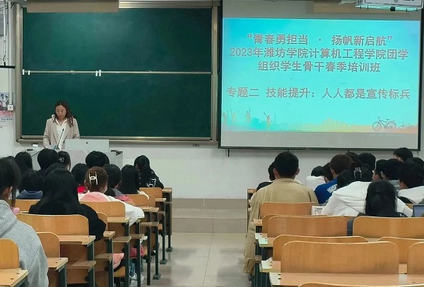 4月13日,“青春勇担当·扬帆新启航”2023年潍坊学院计算机工程学院团学组织学生骨干春季培训班第二次专题学习在天一楼7223教室成功举办,此次专题学习特别邀请大学生网络传媒中心学生骨干进行专题培训分享,辅导员张潇、贺梦凡、王芳及各年级学生骨干约140人参加。