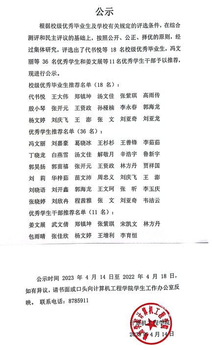 2023届校级优秀毕业生、优秀学生、优秀学生干部公示