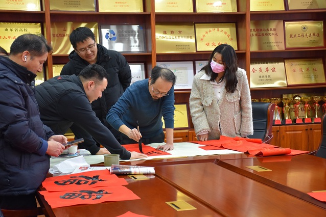 桃李迎春辞旧岁,笔墨浓情送祝福。为迎接新年,我院于1月18日在天一楼举办“迎新春、赠春联”活动,孟凡楼老师为大家献福、写联,同时还邀请到学校书画协会主席杨德永老师一同为大家挥笔书写祝福。
