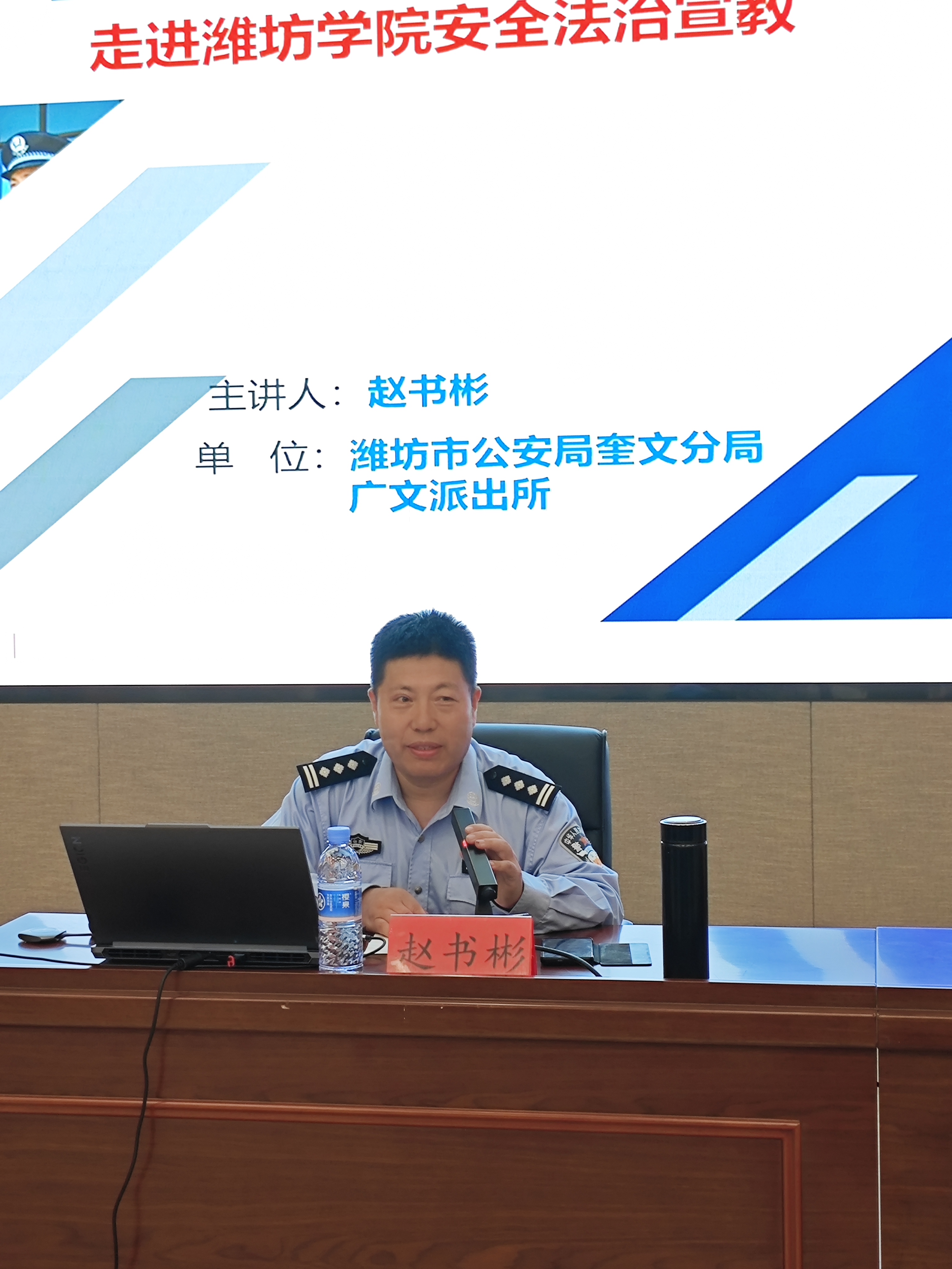 为进一步做好辖区单位安全工作,切实排查化解社会矛盾纠纷,严防各类矛盾蔓延激化,确保辖区矛盾早发现、早控制、早处置及社会大局稳定,2025年9月26日晚上,潍坊学院计算机工程学院2025级“做安全和谐发展促进者”安全法制宣讲活动在4109教室举行。学院党委副书记朱万山出席活动并作开篇讲话,松鹤园张面河警务室公安人员受邀担任宣讲嘉宾。