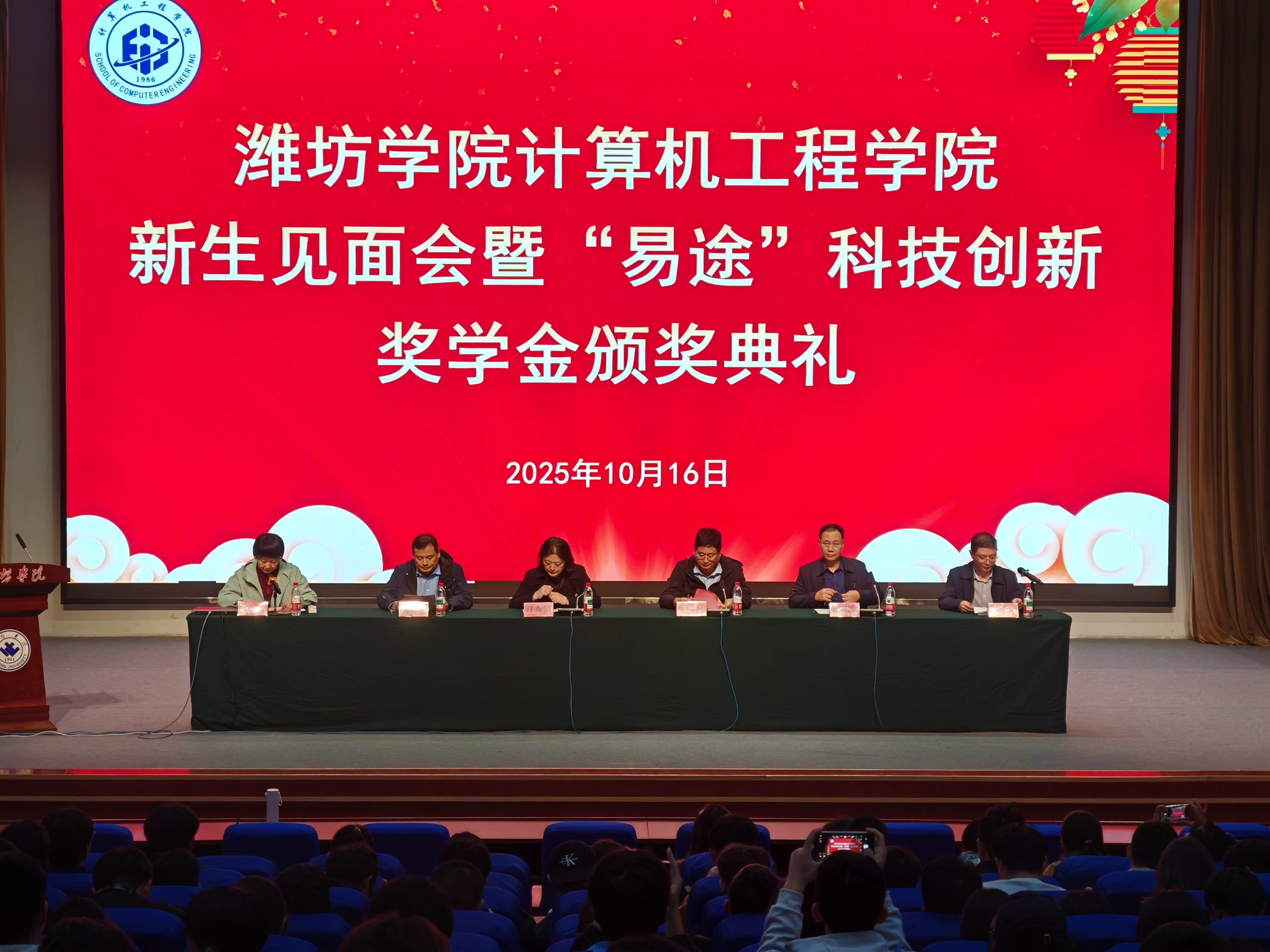 2025年10月16日晚 ,计算机工程学院2025级新生见面会暨奖学金颁奖仪式活动于学校图书馆报告厅隆重举行。潍坊学院教务处处长、计算机工程学院院长侯金奎,学院党委书记任秀洁,党委副书记朱万山,副院长刘瑜、王涛,山东易途信息科技有限公司市场专员时念新出席。2025级班主任代表、全体辅导员、2025级新生及奖学金获奖学生参加。