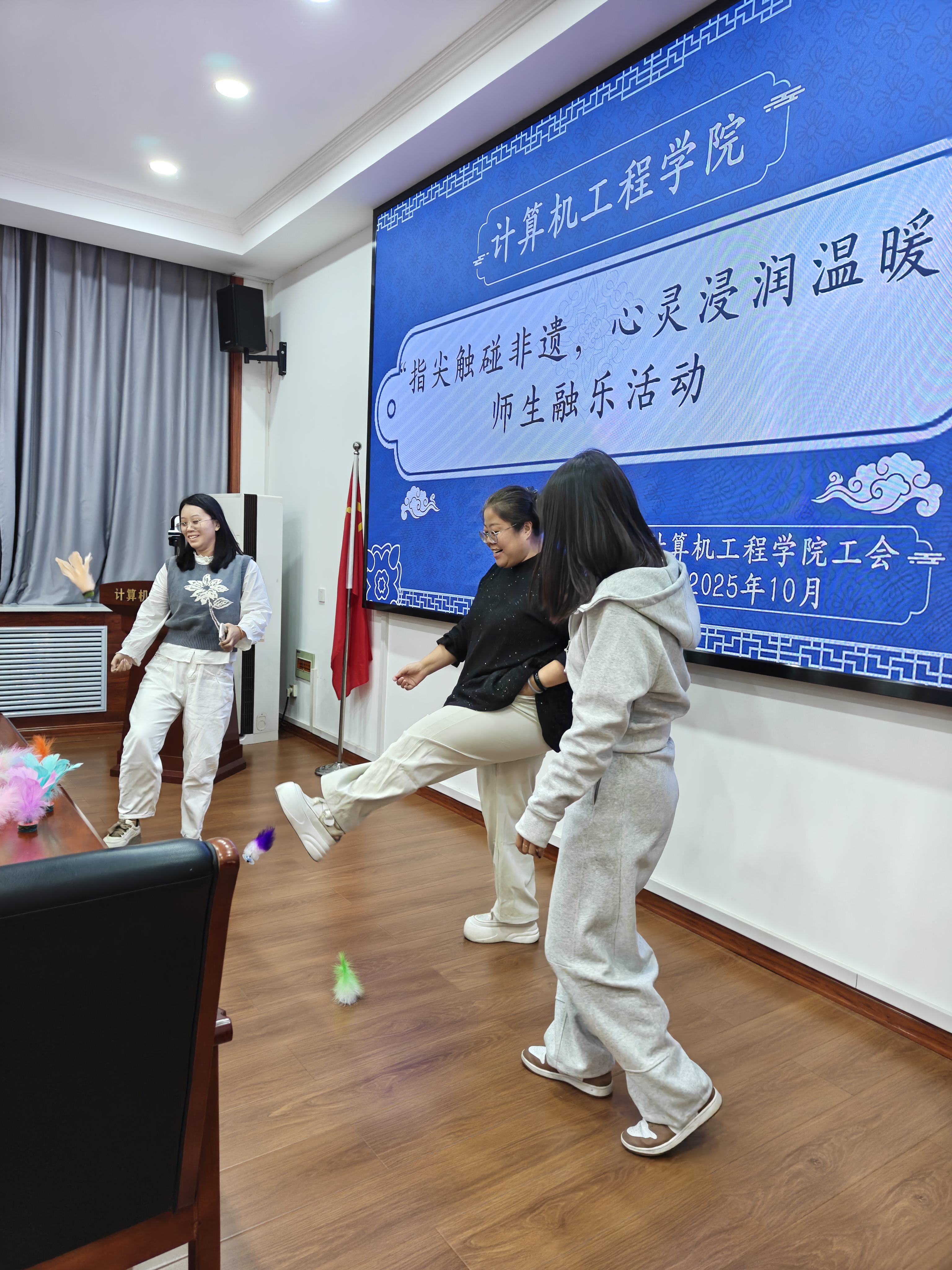 随后,进入“毽舞飞扬”环节中,师生手持花毽,在互动中体验传统体育的乐趣。从静观到动身,从展示到竞技,会议室里充满了欢声笑语。大家在运动中释放压力,在协作中增进情谊,更在传统体育与非遗艺术的交相辉映中,感受传统文化生生不息的魅力