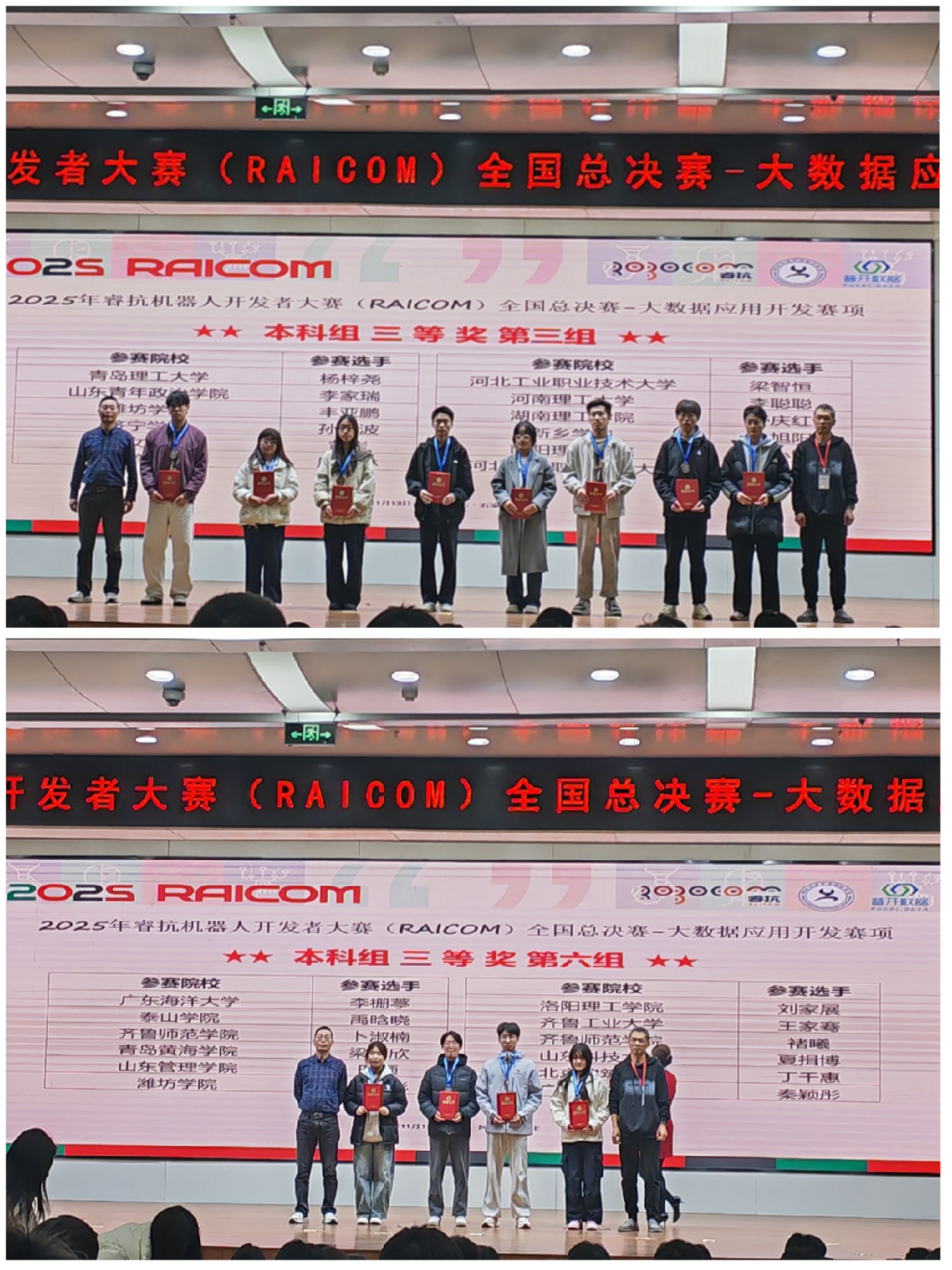 2025年睿抗机器人开发者大赛(RAICOM)全国总决赛-大数据应用开发赛项在河北工业职业技术大学圆满落幕。本次大赛于11月14日至16日正式举办,经过为期三天的激烈角逐,计算机工程学院学子凭借扎实的专业功底、出色的创新思维和默契的团队协作脱颖而出,最终斩获全国一等奖1项、二等奖1项、三等奖2项,充分展现了计算机工程学院学子的过硬综合素质。