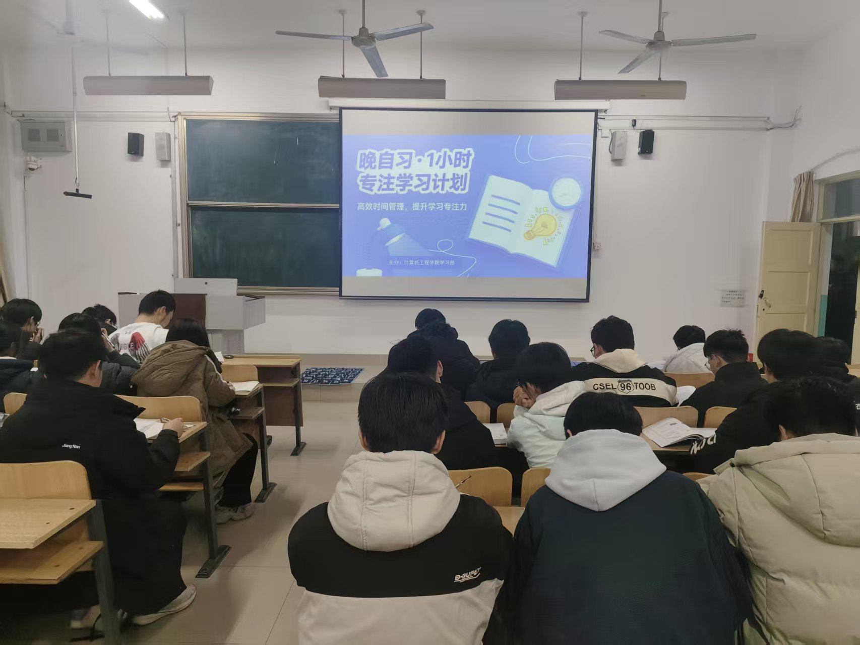 为营造勤学善思的优良学风,深入推进学风建设,引导和帮助同学们高效利用课余时间夯实专业基础、提升学习效率,计算机工程学院于11月22日在天一楼7210教室举办“晚自习一小时专注学习”专项学习活动,吸引大一学生积极参与。
