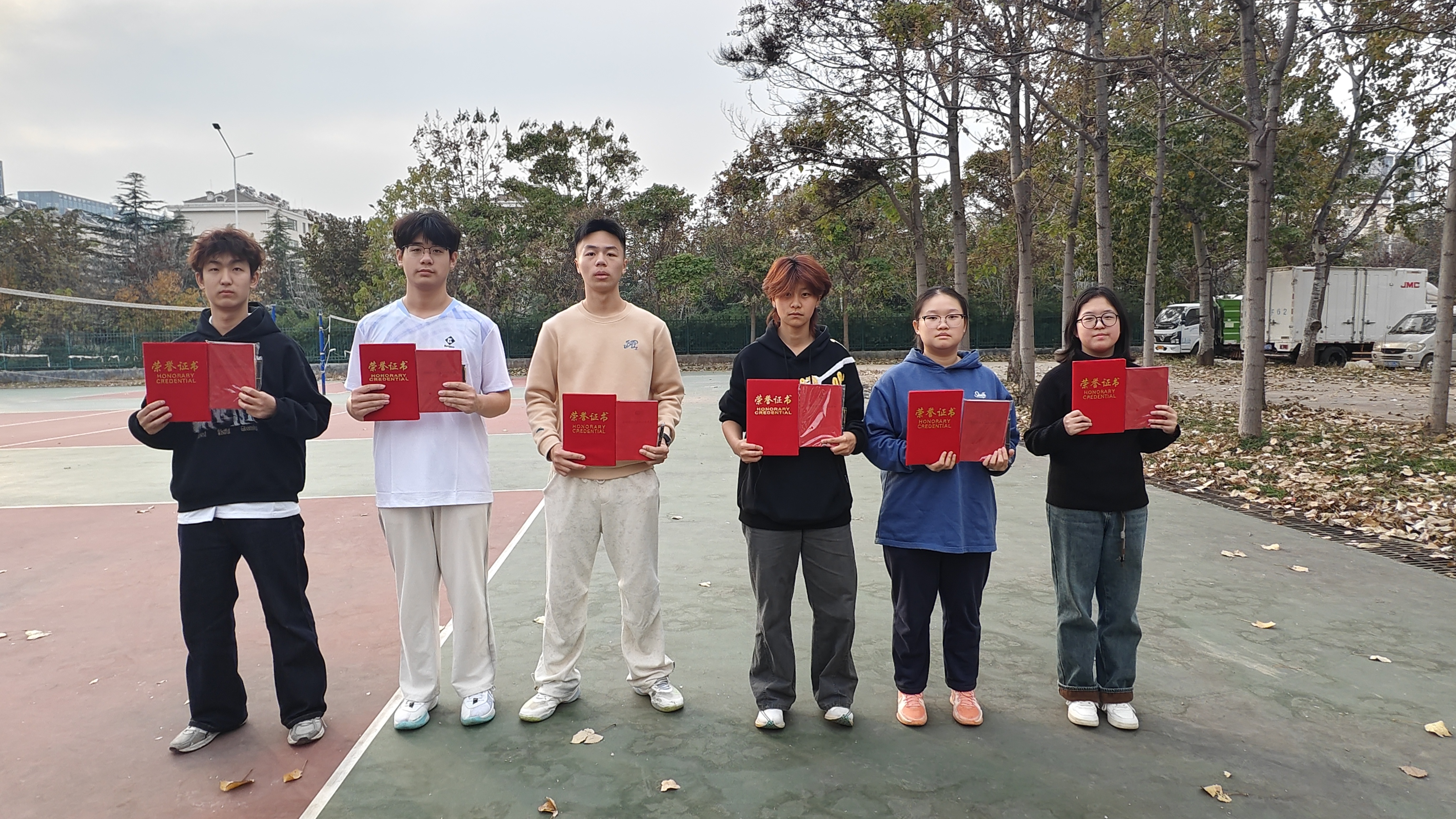 经过多轮激烈角逐,各项目获奖名单最终揭晓:男子单打冠军由杨谨泽斩获,翟俊智获得亚军,鲁芳恺拿下季军;女子单打冠军归属张祺婧;田兴雨与李雨杉凭借默契配合摘得女子双打冠军。颁奖环节中,工作人员为获奖选手颁发荣誉证书与奖品,全体合影留念,定格下这一荣耀时刻。