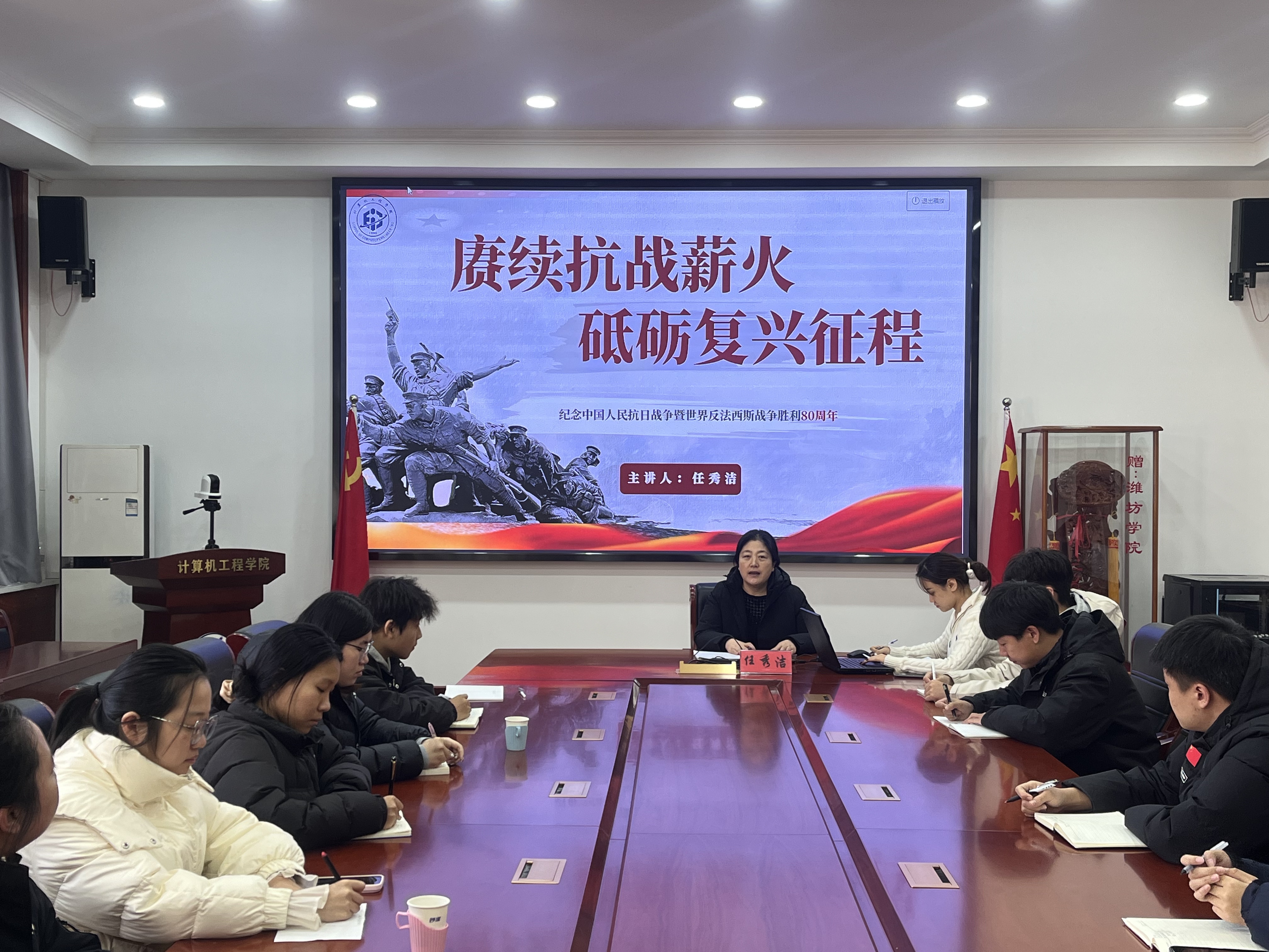 为深入学习贯彻习近平总书记在纪念中国人民抗日战争暨世界反法西斯战争胜利80 周年大会上的重要讲话精神,弘扬伟大抗战精神,引导计算机工程学院新发展预备党员坚定理想信念、厚植家国情怀,计算机工程学院党委书记任秀洁以“赓续抗战薪火 砥砺复兴征程” 为主题,为计算机工程学院预备党员讲授专题党课,带领青年学子在回望历史中汲取奋进力量,在铭记初心中明确前行方向。