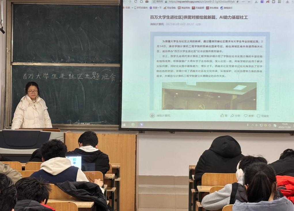为推动“百万大学生进社区”社会实践活动走深走实,2025年11月25日,计算机工程学院组织24、25级全体学生开展主题班会。本次班会以政策宣讲、实践指引为核心任务,通过政策解读、案例分享、经验交流等形式,为同学们搭建起理论联系实际、青春服务社会的实践桥梁。