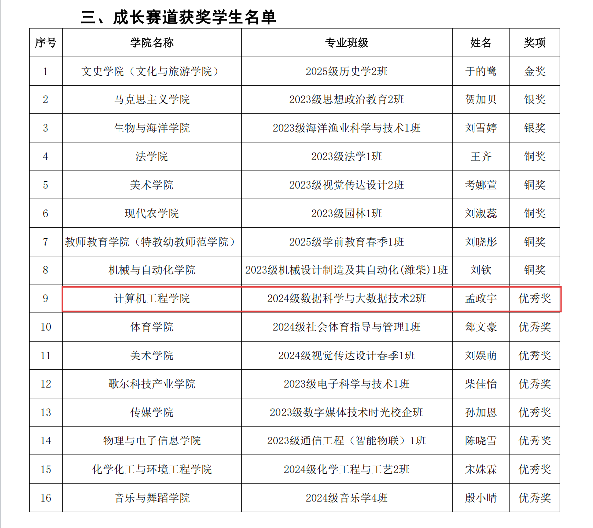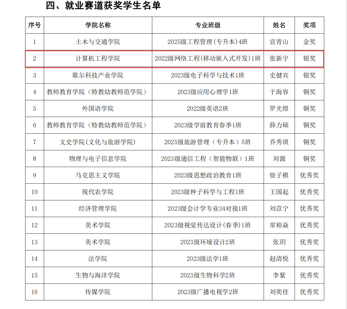 本次大赛中,辅导员王芳凭借卓越的指导工作荣获“优秀指导教师”称号。在各位指导老师的悉心培育下,学院学子在两大主赛道上均斩获佳绩:2022 级网络工程(移动嵌入式开发)专业的张新宇同学,于就业赛道中表现突出,摘得银奖;2024 级数据科学与大数据技术专业的孟政宇同学,则在成长赛道上崭露头角,荣获优秀奖。