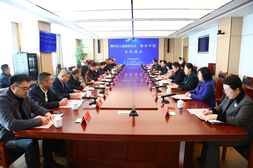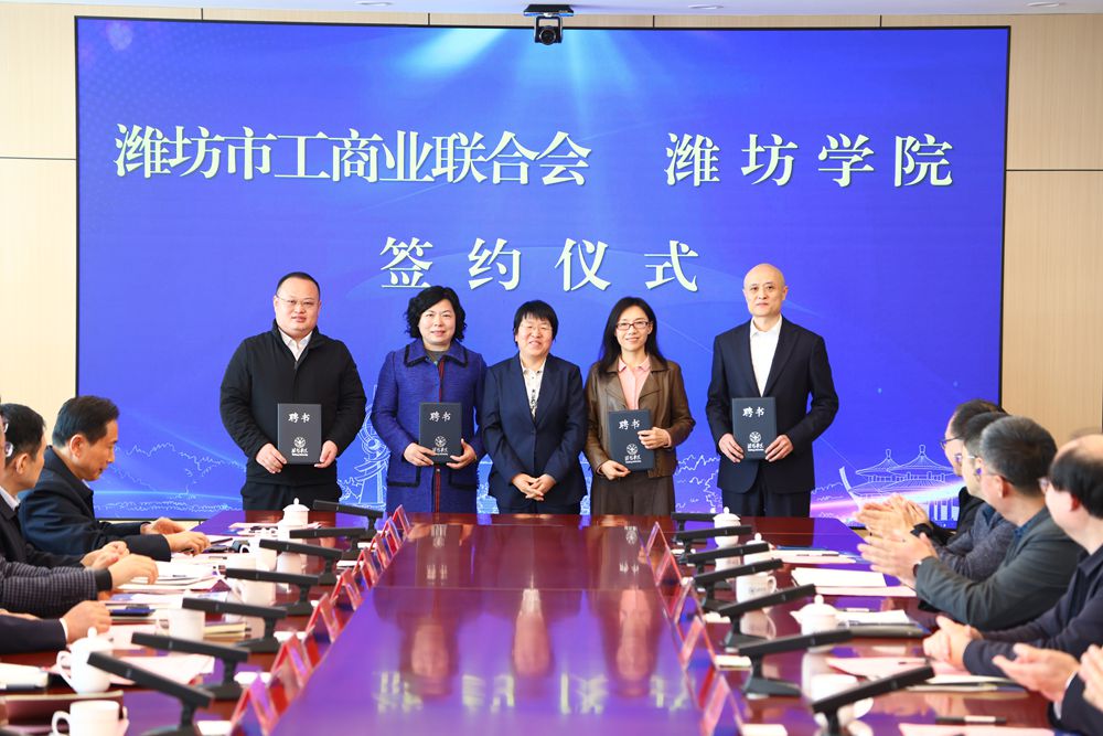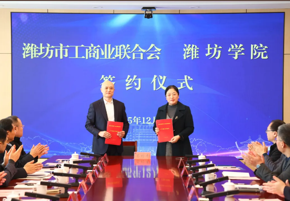 12月30日,学校与潍坊市工商业联合会举行全面合作框架协议签约仪式。潍坊市人民政府副市长、市工商联主席陈端梅,学校党委书记来逢波出席活动并致辞。学校党委副书记、校长王霞主持活动。潍坊市人民政府办公室副主任赵昌丽,潍坊市委统战部副部长、市工商联党组书记、常务副主席刘兴成,学校党委委员、副校长李英德出席活动。
