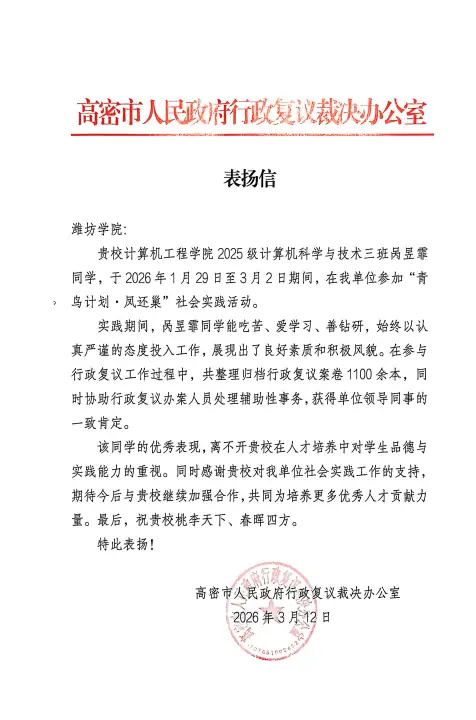 近日,高密市人民政府行政复议裁决办公室向潍坊学院发来表扬信,对计算机工程学院2025级计算机科学与技术三班呙昱霏同学在“青鸟计划·凤还巢”社会实践活动中的优异表现给予充分肯定。