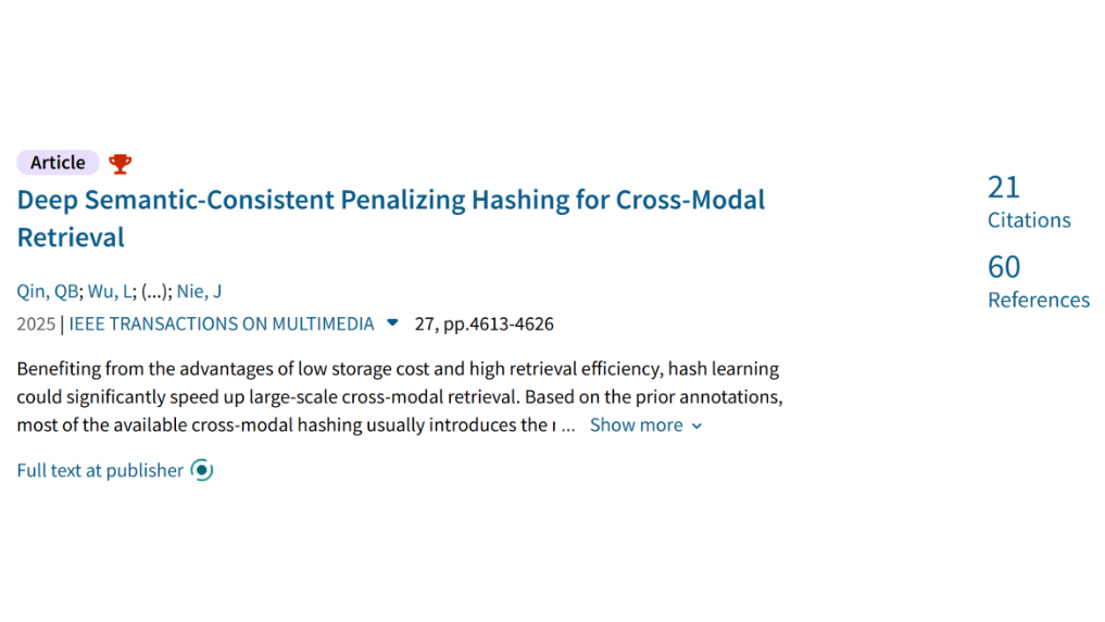 近日,国际权威学术评价机构科睿唯安 (Clarivate) 发布的最新 ESI (Essential Science Indicators) 数据显示,计算机工程学院秦琦冰博士所带领的多媒体内容分析与检索研究团队在多媒体领域顶级学术期刊IEEE Transactions on Multimedia(CCF-A类)发表的题为“Deep Semantic-Consistent Penalizing Hashing for Cross-Modal Retrieval”研究论文成功入选ESI全球前1%高被引论文。该文章提出一种新颖的深度语义一致惩罚哈希框架,通过探索不平衡的类内和类间相关性,学习跨类别的一致性决策边界,并开发类骰的优化策略以平衡拉力惩罚项和推力惩罚项,在替代量化方法下为所有类别学习一致的惩罚场,实现准确且高效的跨模态检索。