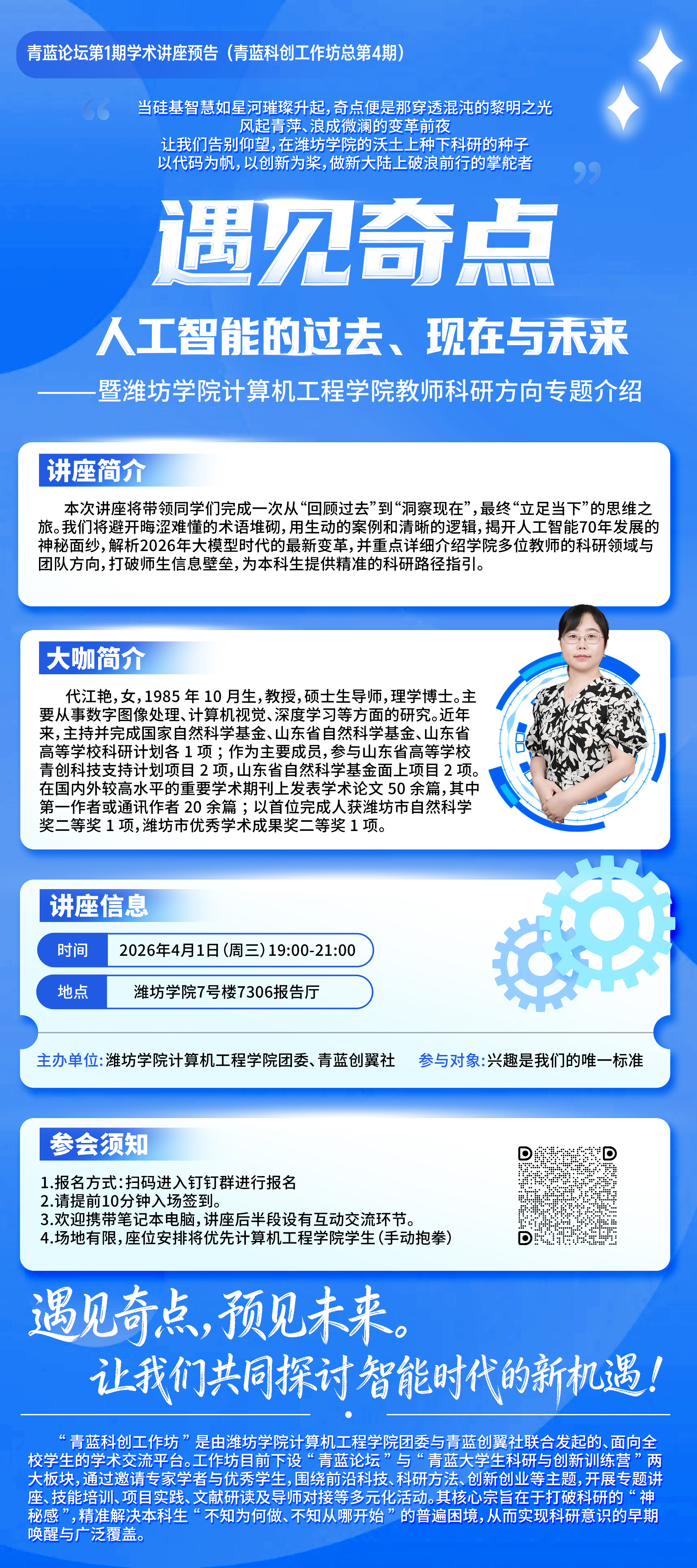 青蓝论坛第1期预告|遇见奇点:人工智能的过去、现在与未来——暨潍坊学院计算机工程学院教师科研方向专题介绍