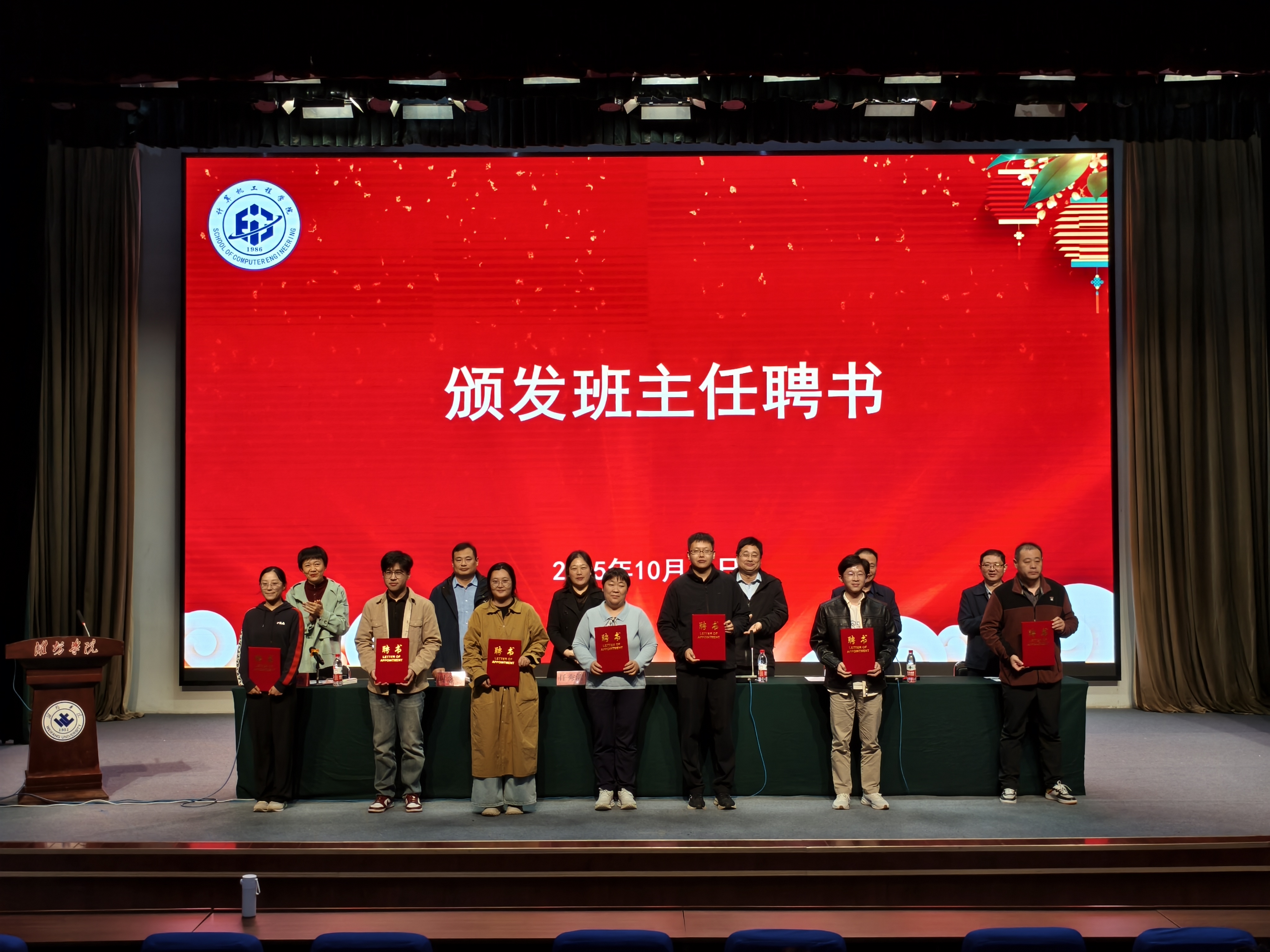 2025年10月16日晚 ,计算机工程学院2025级新生见面会暨奖学金颁奖仪式活动于学校图书馆报告厅隆重举行。潍坊学院教务处处长、计算机工程学院院长侯金奎,学院党委书记任秀洁,党委副书记朱万山,副院长刘瑜、王涛,山东易途信息科技有限公司市场专员时念新出席。2025级班主任代表、全体辅导员、2025级新生及奖学金获奖学生参加。